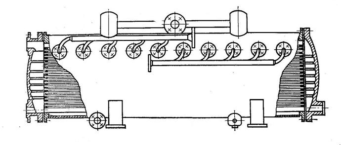 1. Верхней части корпуса испарителя над трубным пучком установлено несколько распределительных коллекторов с форсунками.