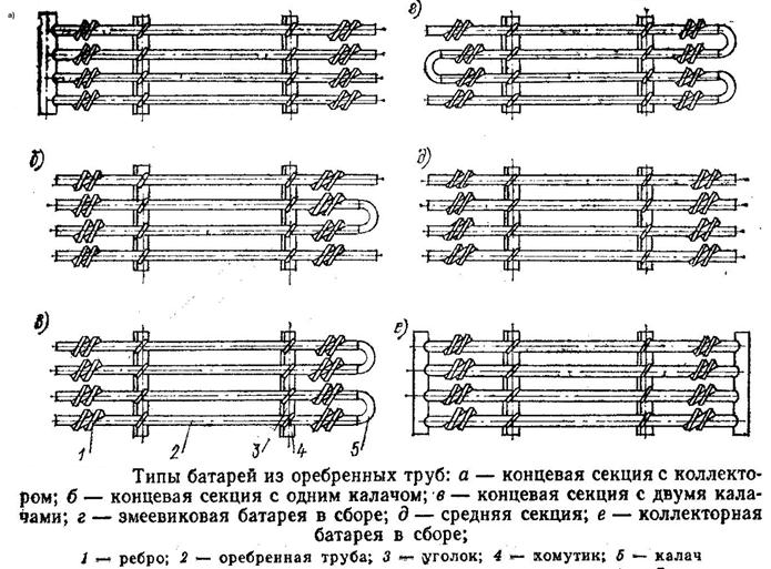 В настоящее время наибольшее распространение получили оребреные батареи. Они собираются из стандартных секций. Промышленностью выпускаются 6 типов секций. Змеевиковые (СГ,СС,СХ,СК,С2К,СЗ). Комбинируя различные типы секций можно изготовить батарею любой площади, любой конфигурации.