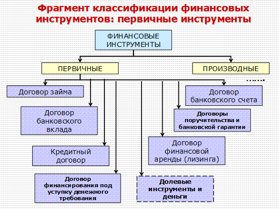 В качестве такого актива могут выступать денежные средства, ценные бумаги, дебиторская задолженность и др. Один из возможных вариантов классификации первичных финансовых инструментов приведен на рисунке.