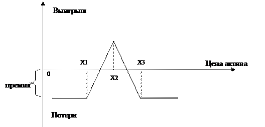 Спрэд длинная бабочка строится с помощью приобретения опциона колл с более низкой ценой исполнения Х1 и опциона колл с более высокой ценой исполнения Х3, и продажи двух опционов колл с ценой исполнения Х2, которая находится посередине между Х1 и Х3. Таким образом, Х3- Х2= Х2- Х1. Обычно цена Х2 лежит близко к текущей рыночной цене актива в момент заключения сделок. Такой спрэд требует небольших первоначальных инвестиций. Вкладчик использует данную стратегию, когда не ожидает сильных колебаний цены. Он получит небольшую прибыль, если цена актива не намного отклонится от Х2, и понесет небольшие потери, если произойдет существенный рост или падение цены. Конфигурация спрэда представлена на рисунке.