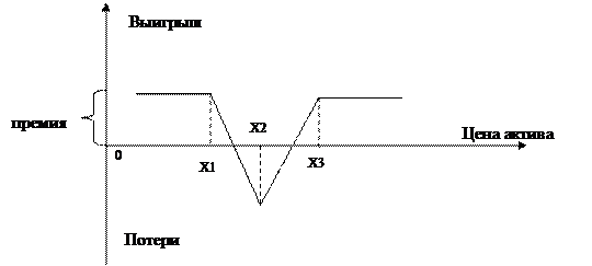 Спрэд короткая бабочка создают в обратном порядке, т.е. продают опционы с ценами исполнения Х1и Х3 и покупают два опциона с ценой исполнения Х2. Данная стратегия позволяет получить невысокий доход при значительных колебаниях рыночной цены актива; одновременно она ограничивает потери при незначительном отклонении цены от первоначального уровня (рисунок).