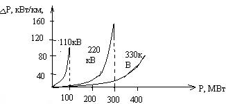 Зависимость удельных потерь мощ-ти от передаваемой мощ-ти ЛЭП и напряжения: