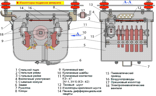 По обеим сторонам кулачкового барабана, на стальных рейках между передней и средней рамами установлены кулачковые контакторы силовой цепи. На рейках, связывающих среднюю и заднюю рамы, установлены кулачковые контакторы цепи управления.