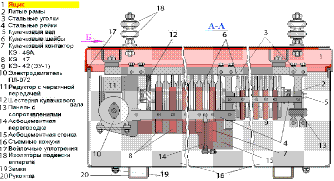 предназначен для выведения пуско-тормозных сопротивлений из цепи тяговых двигателей в процессе пуска и электрического торможения вагона, а также для изменения поля двигателей в ходовом и тормозном режимах. Выведение сопротивлений – это их шунтирование (исключение из цепи тяговых двигателей) контактами кулачковых контакторов в процессе перехода кулачкового вала с одной позиции на другую.