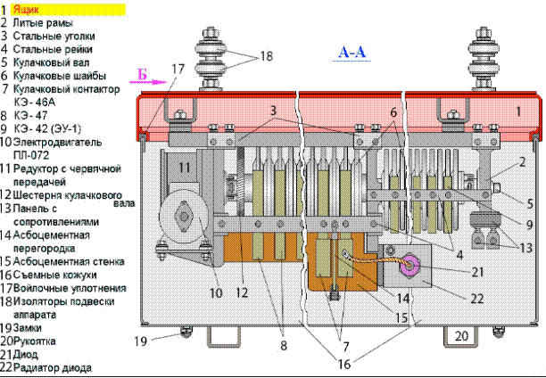 предназначен для изменения режимов работы силовой схемы, т.е. для переключения силовой схемы с последовательного соединения групп тяговых двигателей в ходовом режиме на параллельное соединение, а также для переключения её из ходового режима в тормозной и обратно.