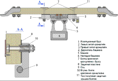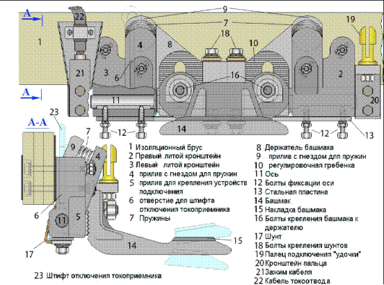 Кронштейны имеют приливы с гнездами для пружин. На одном из кронштейнов имеется прилив для крепления кронштейна с пальцем, на который в депо надевают втулку подвижного кабеля – «удочку». На другом кронштейне расположен зажим силового кабеля.