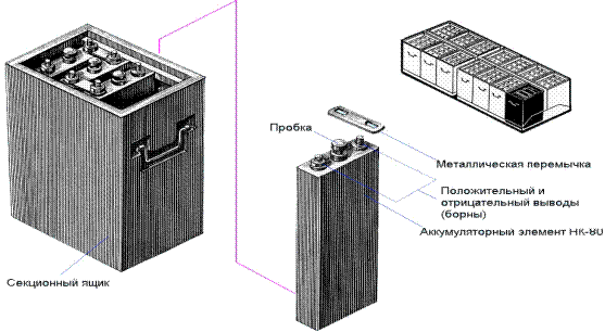 Батарея состоит из 56 щелочных аккумуляторов типа НК-80 (никель-кадмиевые), соединенных между собой последовательно. Ёмкость одного аккумулятора, как и всей батареи, 80 А·ч (ампер-часов), что означает: ток разряда, скажем, 1А батарея способна отдавать 80 часов. ЭДС полностью заряженного аккумулятора 1,4В. Таким образом, ЭДС батареи 78,4В. В процессе разряда ЭДС щелочных аккумуляторов уменьшается до 1,1В.