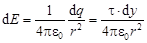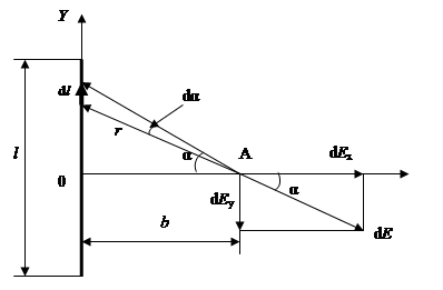Разобьем стержень на бесконечно малые элементы d l= d y; y – координата данного элемента. Заряд элемента d q= τd y можно считать точечным. Напряженность поля, созданного зарядом d q в точке А на расстоянии r от заряда, равна: