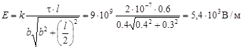 Определить напряжённость поля, создаваемого зарядом, равномерно распределённым по тонкому прямому стержню с линейной плотностью 200 нКл/м, в точке, лежащей на перпендикуляре, восстановленном в середине стержня, на расстоянии 40 см от его середины. Длина стержня 60 см (рис. 1.21).
