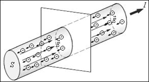Рис. 2.1. Движение электронов в проводнике с площадью поперечного сечения проводника ‑ S и током ‑ I;