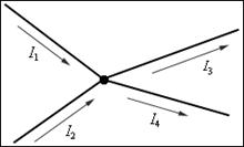 Рис. 2.7. Узел электрической цепи. I 1, I 2 > 0; I 3, I 4 < 0