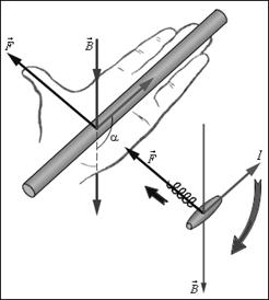 Рис. 3.7. Правило левой руки и правило буравчика для определения направления силы Ампера