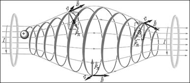 Рис. 3.10. Заряженные частицы не выходят за пределы магнитной «бутылки». Поле может быть создано с помощью двух круглых витков с током