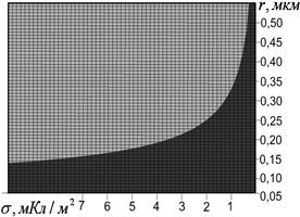 Рис. 8.2. Границы применимости классической формулы для расчета напряженности электрического поля заряженной плоскости в случае распределения заряда в слое малой конечной толщины. Светлое поле – относительная ошибка