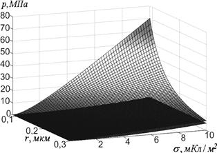 Рис.8.3. Зависимости пондеромоторного давления от расстояния до плоскости и от поверхностной плотности заряда. Темная поверхность соответствует непрерывному, светлая – дискретному распределению одной и той же величины заряда по плоскости.