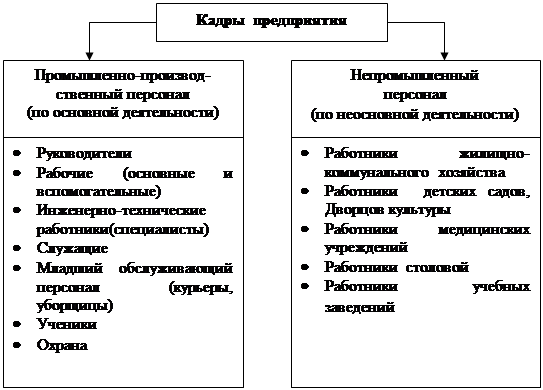 Все работники предприятия разделяются на две группы: персонал основной деятельности и персонал неосновной деятельности. В зависимости от функционального назначения состав кадров промышленного предприятия можно представить схемой (рис. 5. 1).