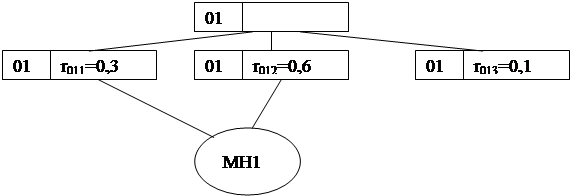Пример: функция 01 реализуется тремя функциями низшего ранга 011, 012, 013 (рис. 7. 4), а материальный носитель МН1 реализует две функции 011 и 012.