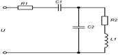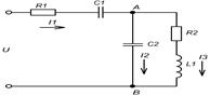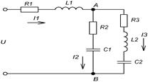 Определить токи в ветвях цепи, активную реактивную и полную мощность, построить векторную диаграмму при следующих данных: R1=57,5 Ом, R2=40 Ом, С1=С2=106 мкФ, L1=95,5 мГн, U=400 В, f=50 Гц.