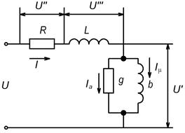 Согласно векторной диаграмме строится схема замещения катушки, состоящая из двух активных сопротивлений и двух идеальных индуктивностей: