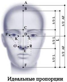Лицо визуально делится на 3 части: от роста волос на лбу до бровей, от бровей до кончика носа, от кончика носа до подбородка. Первая и третья часть должны быть немного уже чем средняя, по высоте все части должны быть одинаковыми. Ширина «идеального» лица равна двум третям высоты, расстояние от линии роста волос на лбу до переносицы по вертикали равно расстоянию от переносицы до кончика носа и от кончика носа до края подбородка в центральной его части. Расстояние между глазами равно длине одного глаза.