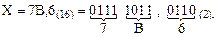 В технике программирования в качестве вспомогательной широкое применение получила шестнадцатеричная СС, у которой основание P = 16, т.е. используется 16 символов – это цифры от 0 до 9 и шесть заглавных букв латинского алфавита: A, B, C, D, E, F. У этой СС основание является целой степенью числа 2, в результате по аналогии с двоично-десятичной СС ее можно определить как систему с основанием P = 16, у которой символы закодированы в двоичной СС, что значительно облегчает перевод шестнадцатеричных чисел в двоичную СС и обратно. Для этого достаточно перевести в двоичную СС каждый символ исходного числа и записать их в виде тетрад. Например, преобразуем шестнадцатеричное число X = 7B,6 в двоичную СС: