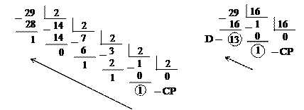 Пример 1. Переведем десятичное число X = 29 в двоичную и шестнадцатеричную СС: