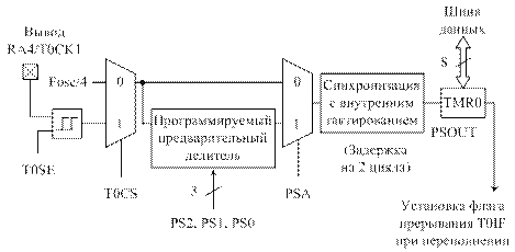 Предварительный делитель может использоваться модулем сторожевого таймера WDT или модулем таймера. Подключение предварительного делителя задается битом PSA (OPTION<3>). Установка бита PSA в «1» подключает предварительный делитель к модулю WDT и устанавливает коэффициент деления для TMR0 1:1. Установка бита PSA в «0» подключает предварительный делитель к модулю таймера. Коэффициент деления предварительного делителя может быть установлен битами PS0-PS2 регистра OPTION (см. таблицу 3). Сам предварительный делитель недоступен для чтения и записи.