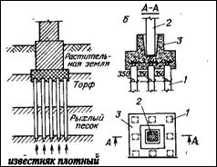 а - на сваях стойках; б — монолитный железобетонный ростверк; 1 — сваи; 2 — колонна; 3 — ростверк
