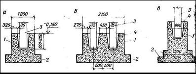 а — под одиночную колонну; б — под спаренные колонны; в — двухблочный фундамент; 1 — подколонник со стаканом; 2 — фундаментная плита (блок); 3 — колонна; 4 — зазор, заполняемый раствором
