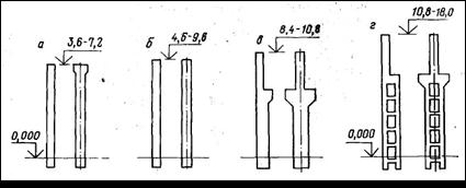 а — прямоугольного сечения для зданий без мостовых кранов с шагом колонн 6 м; б — то же, с шагом 12 м; в — прямоугольного сечения для зданий с мостовыми кранами и шагом колонн 6 и 12 м; г — двухветвевые
