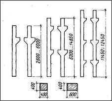 В многоэтажных промышленных зданиях железобетонные колонны применяют одно-, двух-, и трехэтажной разрезки, т. е. высотой на один, два или триэтажа (рис. 2). Колонны имеют опорные консоли для опирания ригелей. Ceчение колонн 400X400 и 400x600 мм. Типовые колонны разработаны для зданий с этажами высотой 3,6; 4,8; 6,0; 7,2 и 10,8 м. Последний размер относится к зданиям с укрупненной сеткой колонн в верхнем этаже или к трехэтажным зданиям с высотами двух нижних этажей по 6 м.