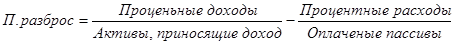 - процентный разброс (спрэд) представляет собой разность между процентами, полученными по активным операциям и уплаченными по пассивным: