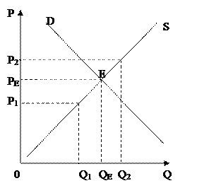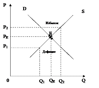 Поиск рыночного равновесия в модели Вальраса начинается с анализа дефицита. Предположим, что установилась цена P1. По такой цене производители ограничиваются предложением Q1. А покупатели по этой цене предъявляют спрос Q2. Возникает избыточный спрос или дефицит. Потребители начинают конкурировать, и это приводит к повышению цен. По линии предложения S вверх движутся производители, реагируя на настроение покупателя. Они встречаются в точке Е. Спрос равен предложению. Устанавливается рыночное равновесие, дефицит исчезает. Модель Вальраса лучше подходит для характеристики процесса установления равновесия в коротком периоде.