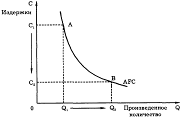 Отложим на оси абсцисс количество выпускаемой продукции, а на оси ординат — издержки. Тогда прямая постоянных издержек, представляющая собой константу, параллельна оси абсцисс. Она обычно обозначается FC. Поскольку с увеличением объема производства растет общая выручка, то средние постоянные издержки представляют собой все меньшую и меньшую величину, приходящуюся на единицу изделий (см. рис. 7.8). Средние постоянные издержки обозначаются AFC (Average Fixed Cost):