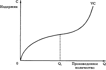 По мере достижения оптимальных размеров производства (в точке Q,) происходит относительная экономия переменных издержек. Однако дальнейшее расширение производства приводит к новому росту переменных издержек, когда увеличение выпуска требует более быстрого роста издержек по сравнению с ростом производства.