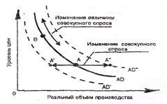 Влияние ценовых и неценовых факторов на совокупный спрос (AD) графически изображено на рис. 1.1. Ценовые факторы совокупного спроса вызывают изменение величины AD. Графически это отражается движением по заданной кривой AD вверх или вниз. Неценовые факторы совокупного спроса смещают первоначальную кривую AD вправо или влево.