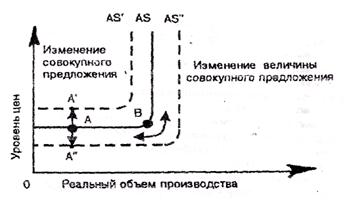 Изменение величины предложения вызывает перемещение точек вдоль постоянной кривой совокупного предложения из положения А в положение В. Изменение уровня цен влияет на изменение величины предложения при неизменности других факторов.