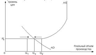 На рис. кривая совокупного спроса АD пересекает кривую совокупного предложения на кейнсианском (горизонтальном) отрезке. В этом конкретном случае уровень цен не играет никакой роли в образовании равновесного реального объема национального продукта.