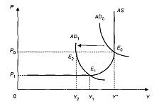Такое "поведение" цен и кривой совокупного предложения объясняется ценовой инертностью затрат на производство продукции. Предприниматель заключает договора на поставку сырья, аренду помещений и оборудования, оплату рабочей силы по определенным ценам, которые он не может изменить произвольно в сторону уменьшения. Поэтому даже при снизившемся совокупном спросе он вынужден предлагать свою продукцию по тем ценам, которые установились первоначально, и, чтобы не оказаться в убытке, резко снижает объем производства.