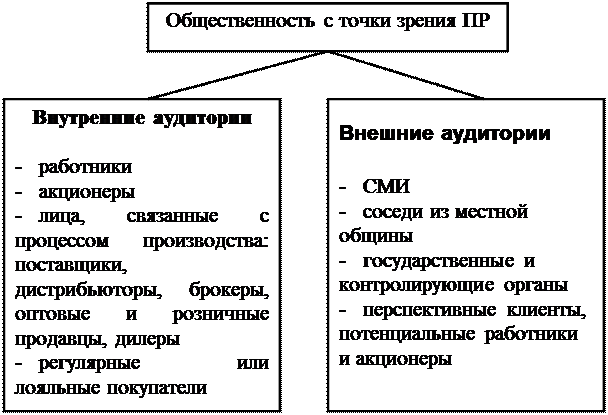 | Среда, в которой работают | - население; - персонал; - партнеры; - общественные организации | - имеющиеся и потенциальные покупатели; конкуренты в продажах и рекламе |