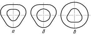 При закреплении тонкостенных втулок, колец, гильз и т.д. в трёхкулачковом патроне для обработки отверстия их цилиндрическая форма искажается от сил зажима. Такие детали при освобождении из патрона теряют форму обработанного отверстия. На рисунке показана схема деформаций тонкого кольца после его закрепления в трехкулачковом патроне (а), после расточки (б) и после снятия со станка (в).
