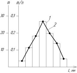 По этим данным стоят гистограмму распределения. Для этого по оси абсцисс откладывают установленные интервалы размеров, а по оси ординат – частоты m, соответствующие этим интервалам. Гистограмму можно также получить в другой системе координат, откладывая по оси ординат частости(отношения m/n).