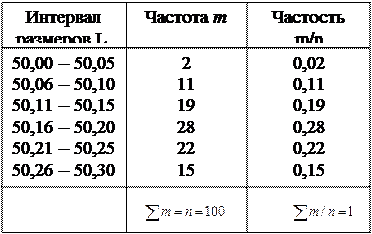 Всю совокупность размеров от наименьшего до наибольшего разбивают на несколько интервалов и определяют числа деталей m, размеры которых попали в данный интервал, т. е. определяют частоты m. Определяют также частости как отношения частот m к общему числу измеренных деталей n (отношение m/n).