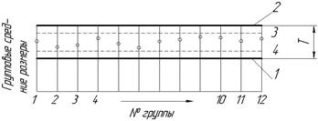 На методе исследования точности точечными диаграммами получил развитие статистический метод контроля. В процессе обработки партии деталей производится выборочный контроль, т.е. периодически берутся пробы (выборки) 2…10 деталей и групповые средние наносятся на контрольную диаграмму. Здесь кроме линий 1,2 ограничивающих допуск, проведены линии 3 и 4, называемые контрольными. Их положение определяется на основе технико-экономических расчетов. Если среднее арифметическое значение группового размера близко или выходит за контрольные прямые необходима подналадка станка. На рисунке показано, что подналадка производилась после 4-й, 6-й и 10-й выборок.