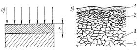 Качество поверхности – это совокупность всех служебных свойств поверхностного слоя материала. Под термином «поверхностный слой» понимается сама поверхность и ее некоторый поверхностный слой, отличающийся от материала сердцевины детали. Глубина слоя h различная в зависимости от условий эксплуатации детали: несколько микрометров – для измерительного калибра, несколько сотен микрометров – для вала машины. Качество поверхностного слоя металла обусловливается свойствами металла и методами обработки: механической, электрофизической, электрохимической, термической и т.д. В процессе механической обработки (резание лезвийным инструментом, шлифование, полирование) поверхностный слой деформируется под действием нагрузок и температуры, а также загрязняется примесями (частицы абразива, кислород) и другими включениями. Упрочненный слой, состоящий из верхнего слоя 1, слоя 2 с текстурой, в котором зерна имеют преимущественную ориентацию, и пластически деформированного слоя 3, в котором существенно увеличено количество дислокаций и других дефектов кристаллической решетки. Этот слой имеет увеличенную по сравнению с сердцевиной 4 детали твердость.
