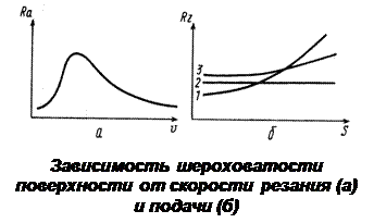 Каждому методу обработки (точение, шлифование и др.) соответствует свой диапазон получаемой шероховатости поверхности. При обработке заготовок лезвийным инструментом шероховатость в значительной мере зависит от скорости резания и подачи. При обработке вязких материалов в условиях образования нароста наибольшее значение Ra наблюдается при скорости резания 20…25 м/мин. Однако с увеличением скорости резания эффект образования нароста снижается и шероховатость уменьшается. Кроме того, при высоких скоростях резания (более 180 м/мин) значительно уменьшается глубина пластически деформированного слоя, что также снижает шероховатость поверхности. Подача S влияет на шероховатость в зависимости от используемого режущего инструмента и условий обработки. При точении стандартными резцами с углом в плане 45 ° и малым радиусом закругления при вершине резца (до 2 мм) подача (свыше 0,2 мм/об) существенно влияет на шероховатость (кривая 1).