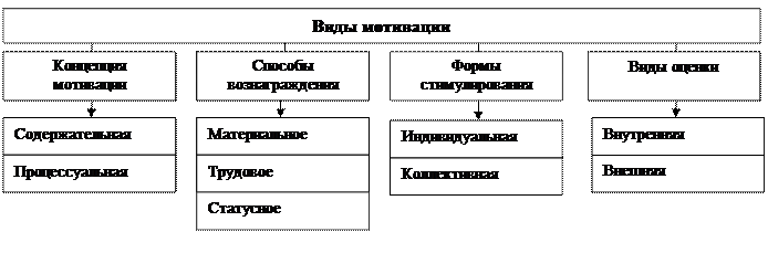 Мотивация – это процесс побуждения человека к плодотворной деятельности исходя из его потребностей и целей предприятия. Виды мотивации представлены на рис.3.1.