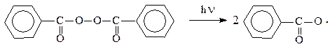 При возбуждении УФ-светом перекись бензоила диссоциирует на два бензоильных радикала. Бензоильный радикал не обладает высокой реакционной способностью.