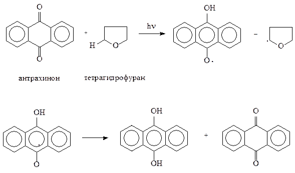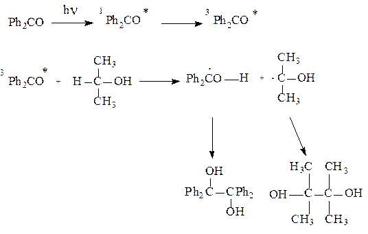 Отрыв атома водорода является характерной реакцией для триплетных молекул ароматических кетонов. Облучение УФ-светом бензофенона в спиртах, например изопропаноле, приводит к продуктам, образующимся через свободные радикалы: