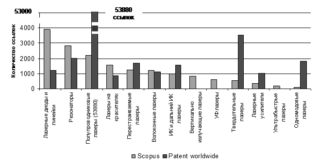 Рис. 3. Количество публикаций по различным типам лазеров по данным Scopus и Patent worldwide